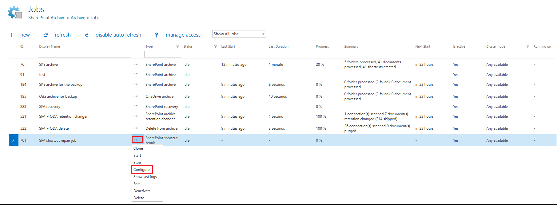 The SharePoint shortcut repair job can be created and configured on the Jobs page. Click the “+ new” button, fill the required settings (Job type, Run on node, Display name) in the pop up window and click on “Add“.