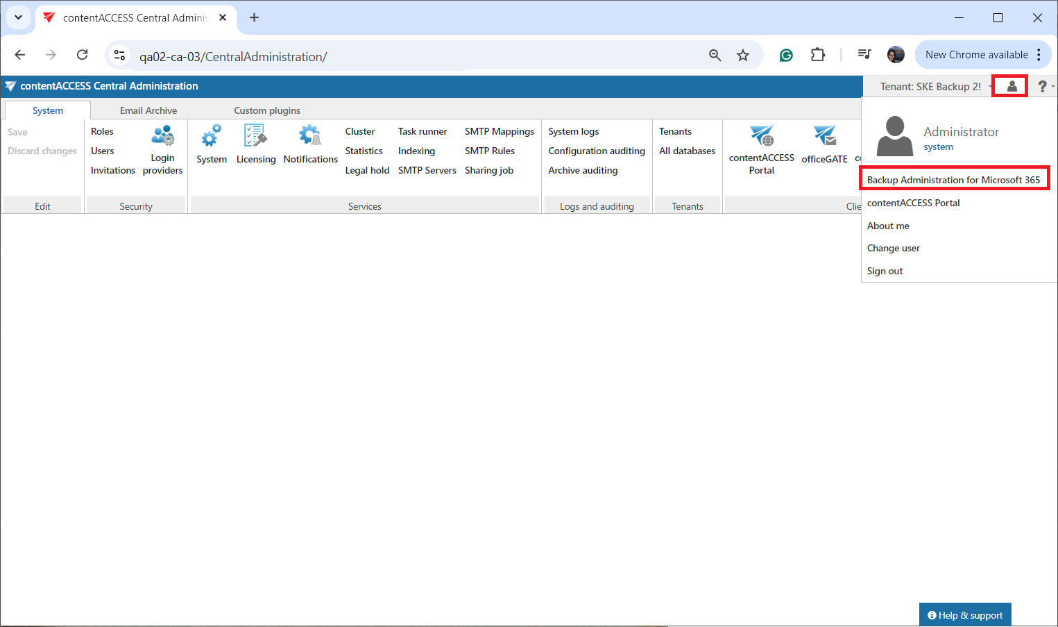 Tenant administrators (as well as system administrators) can also open the Backup Administration directly from the Central Administration using the login menu in the upper-right corner of the interface. Open the menu, select “Backup Administration for Microsoft 365” and the Home page will open in a new browser tab.