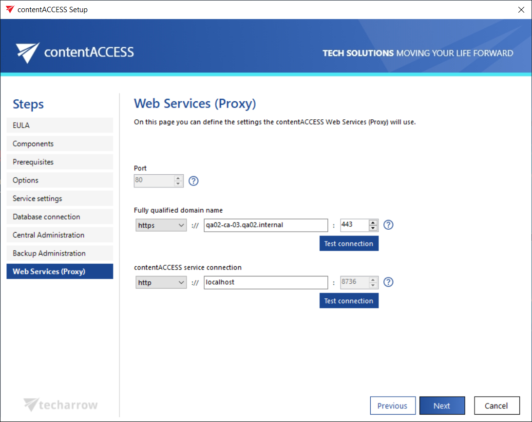 contentACCESS service connection: This URL is used by the contentACCESS Web Services to communicate with the contentACCESS server. If contentACCESS server is installed on the same machine, you can use “localhost” as host name.