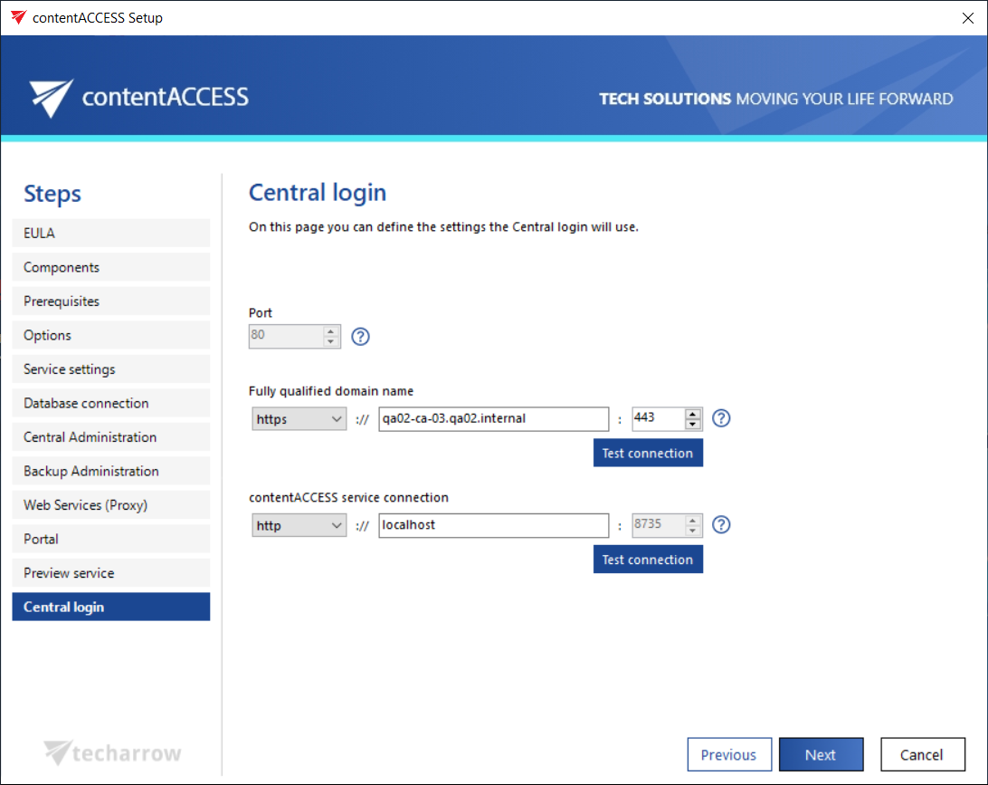 On this page you can specify the settings that the Central login page will use. Same rules apply as for the connection settings of components from above. The FQDN that’s first configured is written by the setup to the System settings of the Central Administration (System tab => Services group => System page, section External accessibility settings: Central login). It can be changed on the respective page of the Central Administration at any time, and the new configuration will be then read and prefilled by the setup when updating the product.