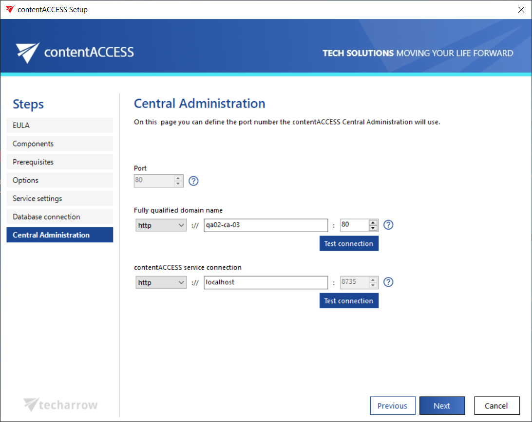 contentACCESS service connection: This URL is used by the Central Administration to communicate with the contentACCESS server. If contentACCESS server is installed on the same machine, you can use “localhost” as host name.