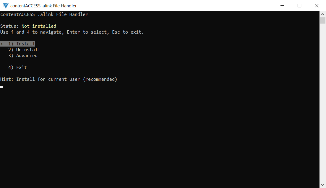 2. Start the application, and on the first screen, select Install and press Enter. This application installs the handler for the current Windows user.