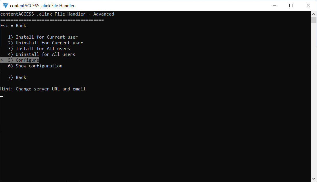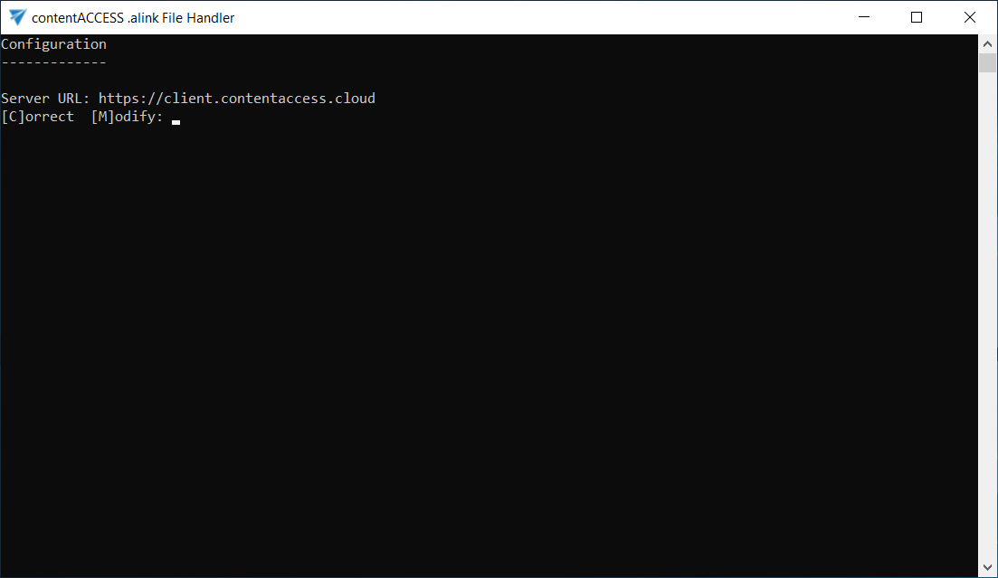 First, you need to configure the server URL. By default, you will see the current server URL (it is typically https://client.contentaccess.cloud). If you wish to keep it, choose [C]orrect.
