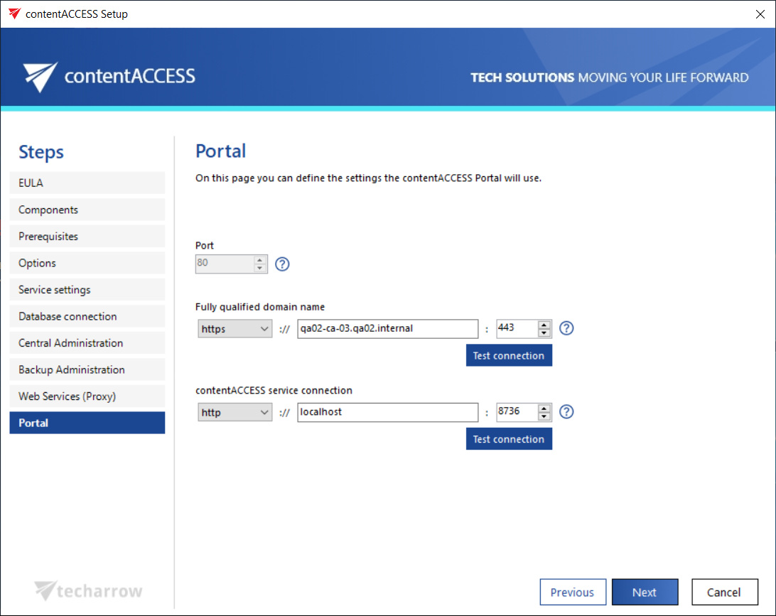 Port: This port is the physical port of contentACCESS Portal used by the Internet Information Services (IIS) on the current server.