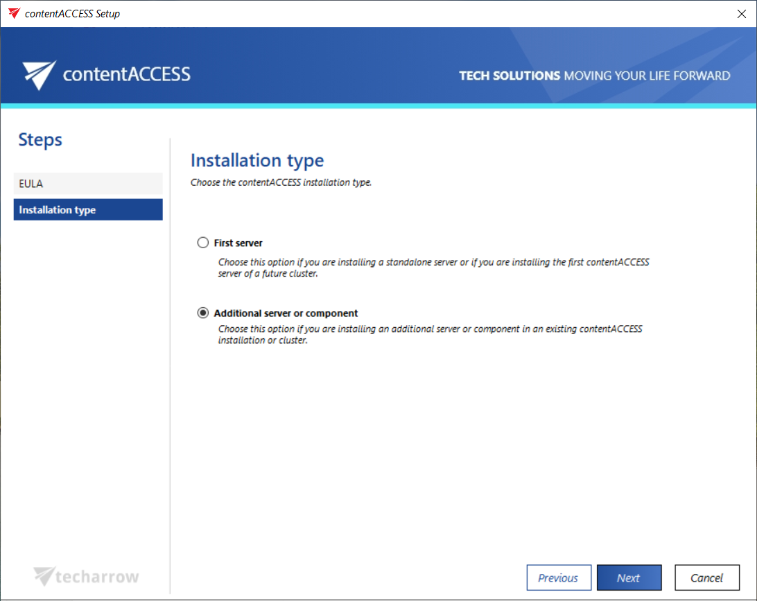 To install any contentACCESS component on a second node, start to run the contentACCESS setup package on the selected server (TECHNB0002). First, you will be required to select the installation type. As we are now installing a contentACCESS component (a node) in an existing contentACCESS environment, we select the “Additional component” option: