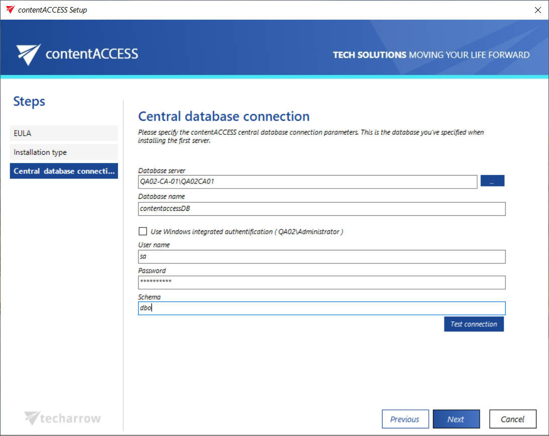 In the next step you will be asked to specify the central database connection that is already used. Enter the server name, where the database is already installed (in our case it is installed on our 1st node called “TANEWS”), enter the name of the already existing system database (in this case it is “contentaccessDB”; can be checked on the SQL server), type here the database user credentials and the database schema.