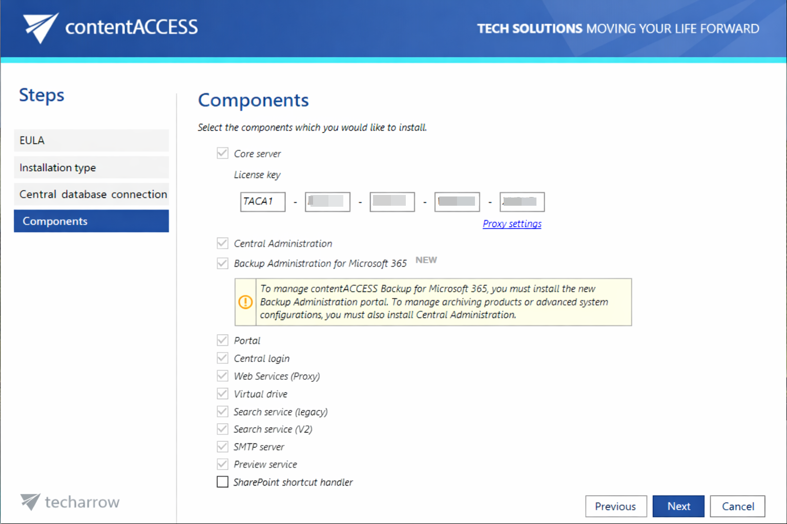 Now, let’s assume that contentACCESS is already installed one the first “main” node (TANEWS), where the file system archive jobs are running. Our customer has decided to buy TECH-ARROWS’s Email archive and he would like to run email archive jobs on a second node. To achieve this, he needs to install the contentACCESS server on a second node (e.g. TECHNB0002).