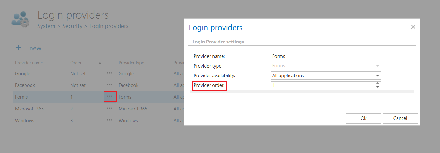 The order can be adjusted at any time by selecting Edit from the context menu (…) of a login provider and setting the desired value in the Provider order field. The “Not set value corresponds to 0. This column is also sortable.