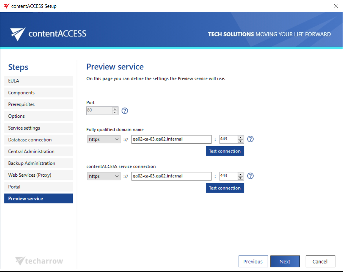 You can define the settings the Preview service will use on this page. The same rules apply as for the connection settings of components from above. The FQDN that’s first configured is written by the setup to the System settings of the Central Administration (System tab => Services group => System page, section Preview service settings: Preview service address). It can be changed on the respective page of the Central Administration at any time, and the new configuration will be then read and prefilled by the setup when updating the product.