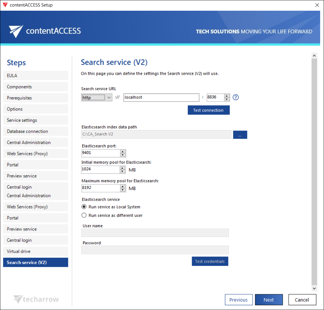Further specify the user credentials used to run the Search service (V2). This can be either Local system user, or an explicit user.