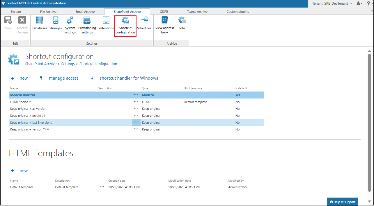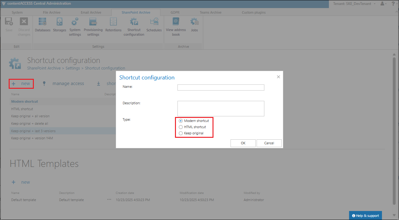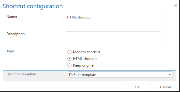 Once your desired template is uploaded, a custom HTML shortcut can be configured. Navigate to SharePoint archive -> Settings -> Shortcut configuration and click on + new under the Shortcut configuration section. The Shortcut configuration dialog opens. Enter a name for the shortcut into the Name field. In the Use HTML template dropdown list select the HTML template that you have created.