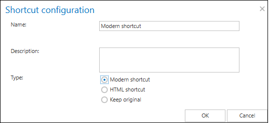 To create a new shortcut, click on + new under the Shortcut configuration section, and select a shortcut type from the Type list of the Shortcut configuration dialog.