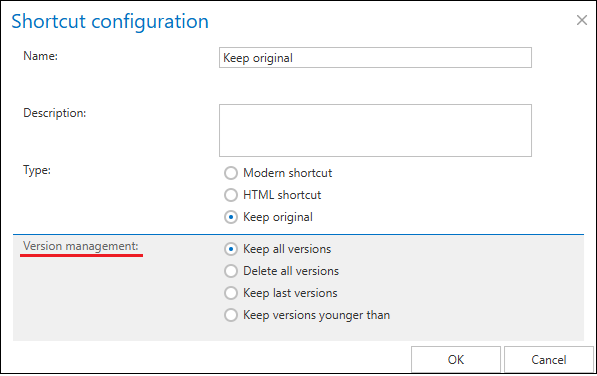 - Keep last versions – delete all versions but keep X last versions (e.g.: 2 last versions; possible values: 1-100)
