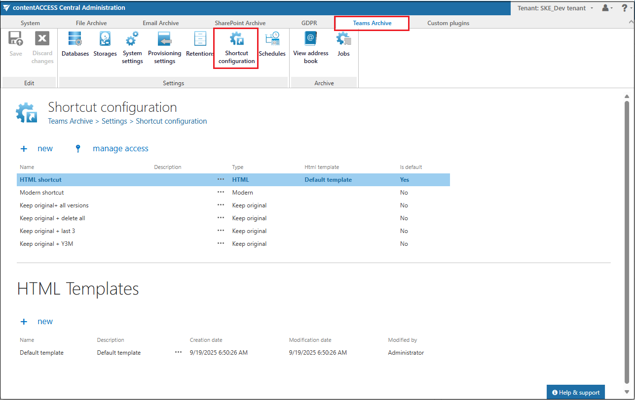 If the user is archiving with a job using an HTML shortcut, the file will be replaced by HTML code which is based on the HTML template. Currently, the Default template is available for the Teams archive. In this template, the version management is set to “Delete all versions”.
