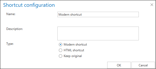 To modify shortcut settings, click on Edit and change the settings in the Shortcut configuration dialog so that the shortcut contains the information that you require. You can also set the selected shortcut as default from the shortcut’s context menu, or you can delete the selected shortcut.