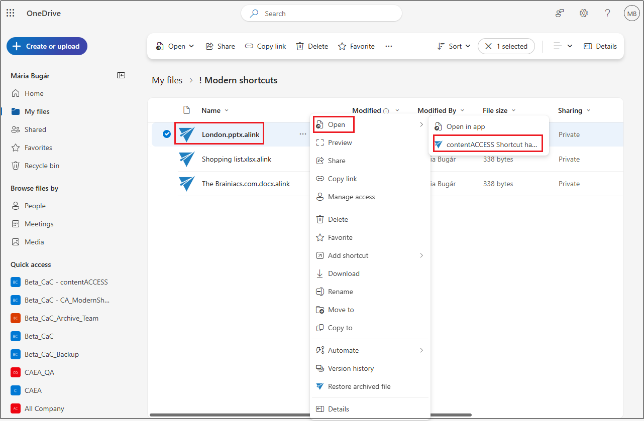 Modern shortcuts in OneDrive can be opened in two ways: simply click on the file name, or use the context menu (… -> Open -> contentACCESS shortcut handler). In both cases, the selected file opens in a new window, where its content is displayed.
