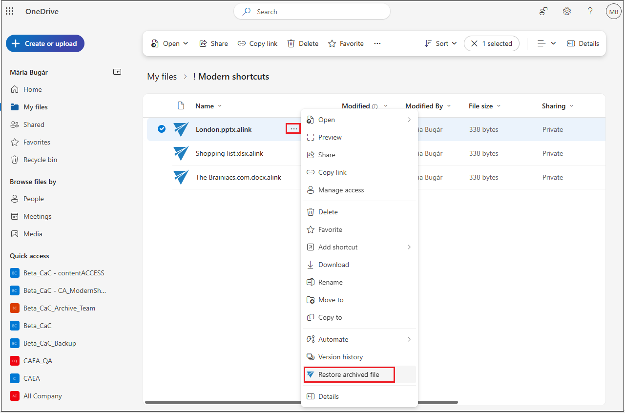 Alternatively, you can select one or more shortcuts from the OneDrive and restore them from the context menu (… -> Restore archived file).