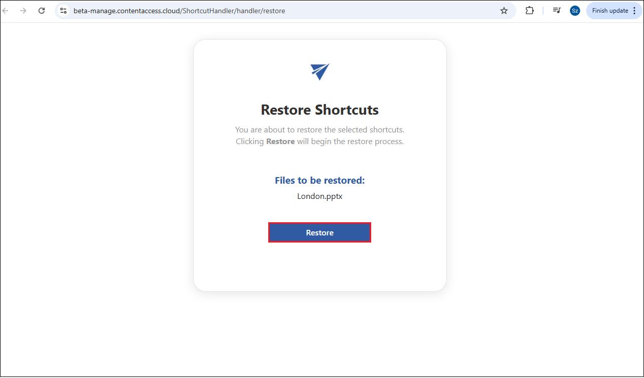 - Restore original – it is also possible to restore the shortcut to the original file from here. In this case, the selected item is opened in the Portal, and the restoring process appears in a pop-up window. When the process is finished, the user can open the restored file in OneDrive (opened in a new tab) or cancel the action and stay on the Portal. This option works similarly to the Recover selected item(s) function in the Portal.