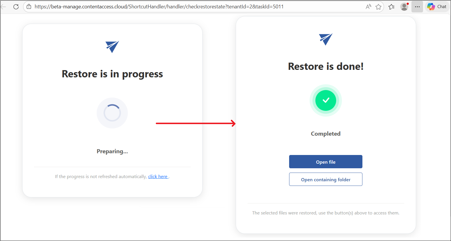 - Restore – this button starts the restore process in a new window. Once the restore is complete, you can either open the restored file or open the folder on SharePoint that contains the file. After closing the preview, the file will be available again in Teams or Team-related SharePoint site with its original format.