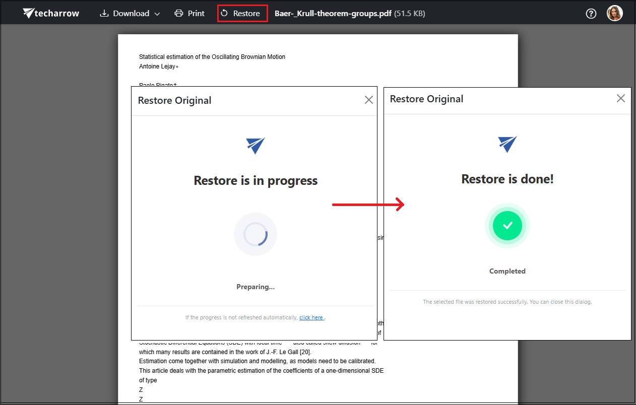 When restoring from the preview, the Restore in progress window appears, followed by Restore is done! once the process is complete. After closing the preview, the file will be available again in SharePoint with its original format.