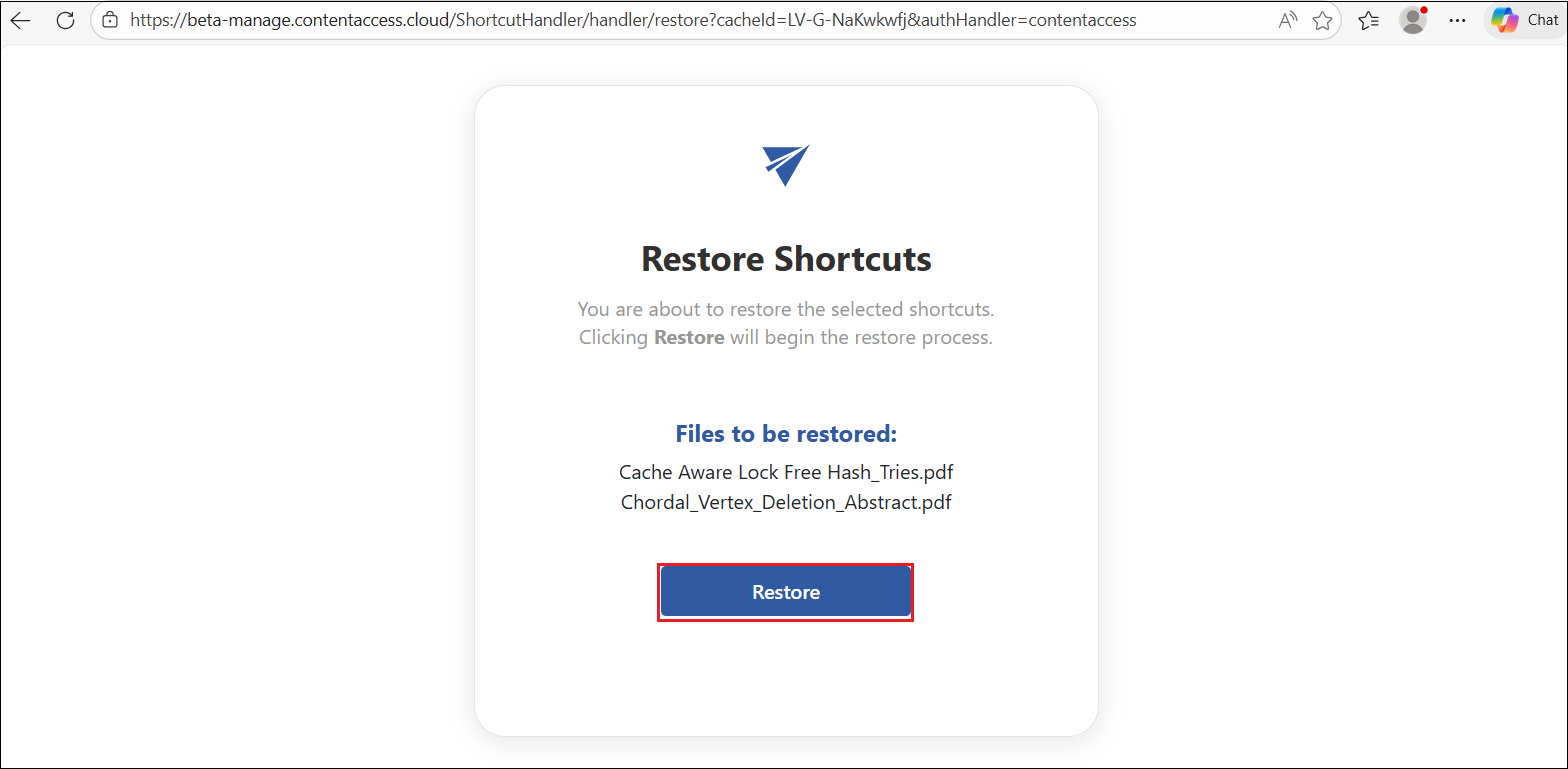- Restore original – it is also possible to restore the shortcut to the original file from here. In this case, the selected item is opened in the Portal, and the restoring process appears in a pop-up window. When the process is finished, the user can open the restored file in SharePoint (opened in a new tab) or cancel the action and stay on the Portal. This option works similarly to the Recover selected item(s) function in the Portal.