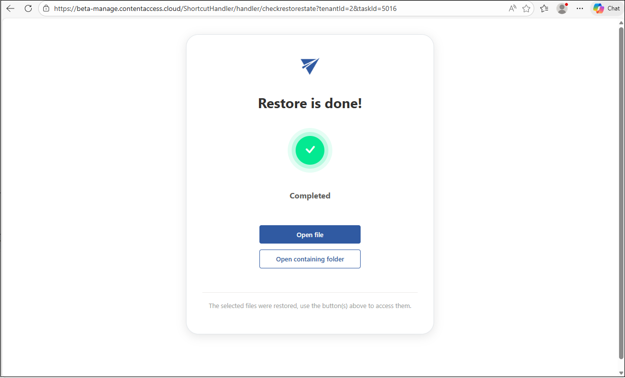 Once finished, two options appear: Open file (available only for single-file restore!) and Open containing folder. The Open file button opens the restored file, while Open containing folder takes you to the folder in the Team-related SharePoint site where the file is located.