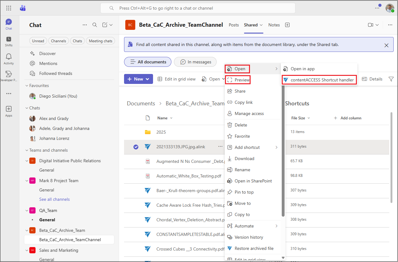 Modern shortcuts in Teams can only be opened from the context menu by selecting Open → contentACCESS shortcut handler or Preview.